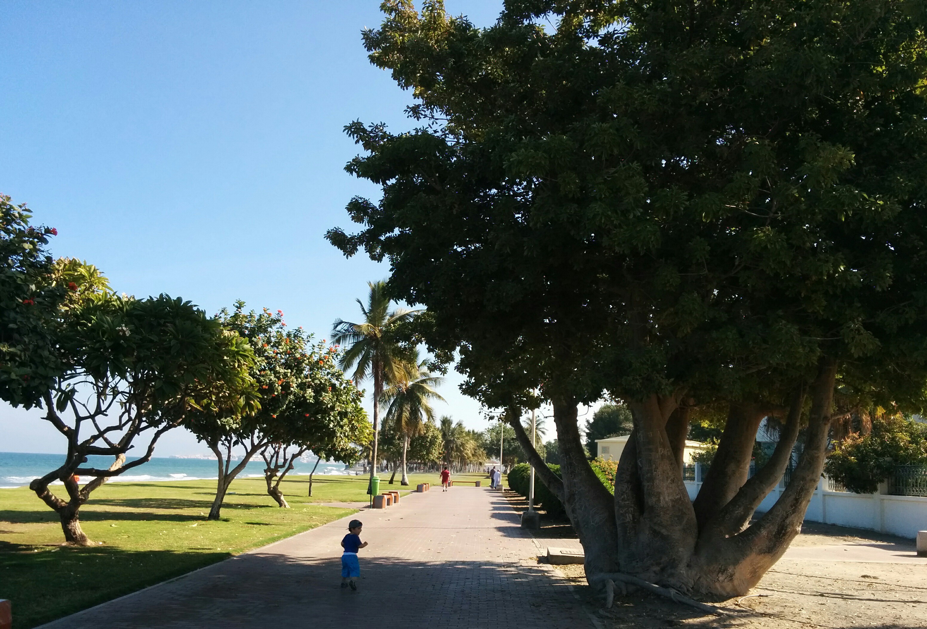 Çocuklu seyahate gelince bizim kaldığımız bölge çocukla ve çocuk arabası ile yürüyüşe çok müsait, kilometrelerce uzanan sahil yolu ile çocuklu aileler için ideal bir yerdi. Muskat’ın ve ülkenin geri kalanı için bunu söyleyemeyeceğim. Her restoranda çocuk sandalyesi alt değiştirme yeri de aramayın. Ama insanların çocuk sevgisi ve de bize her yerde yardımcı olmak için çırpınışları, Elvin’le resim çektirmek istemeleri görmeye değerdi ve bu anlamda ülkeyi gözümde çocuk dostu kategorisine yükseltmeye yetti. Elvin genel olarak her şeyi yiyen bir çocuk olduğundan, ana gıdası süt ve yoğurdu da marketlerde kolayca bulduğumuzdan yemek konusunda sorun yaşamadık. Kaldığımız yerde bebek yatağı olmadığından kendi seyahat yatağını götürdük böylece alındığından beri yatak 1 kere kullanılmış oldu 🙂 Eşimle seyahat ediyor olsaydık muhakkak çocuğu içinde taşıyabileceğiniz sırt çantasını alır ve tüm o vahaların en ücra köşelerine kadar giderdik ama ben tek başıma 15 kiloya yaklaşan bizim Oburcan’ı hakedemeyeceğimi düşündüğümden Umman´da hiking planları başka bir bahara kaldı.