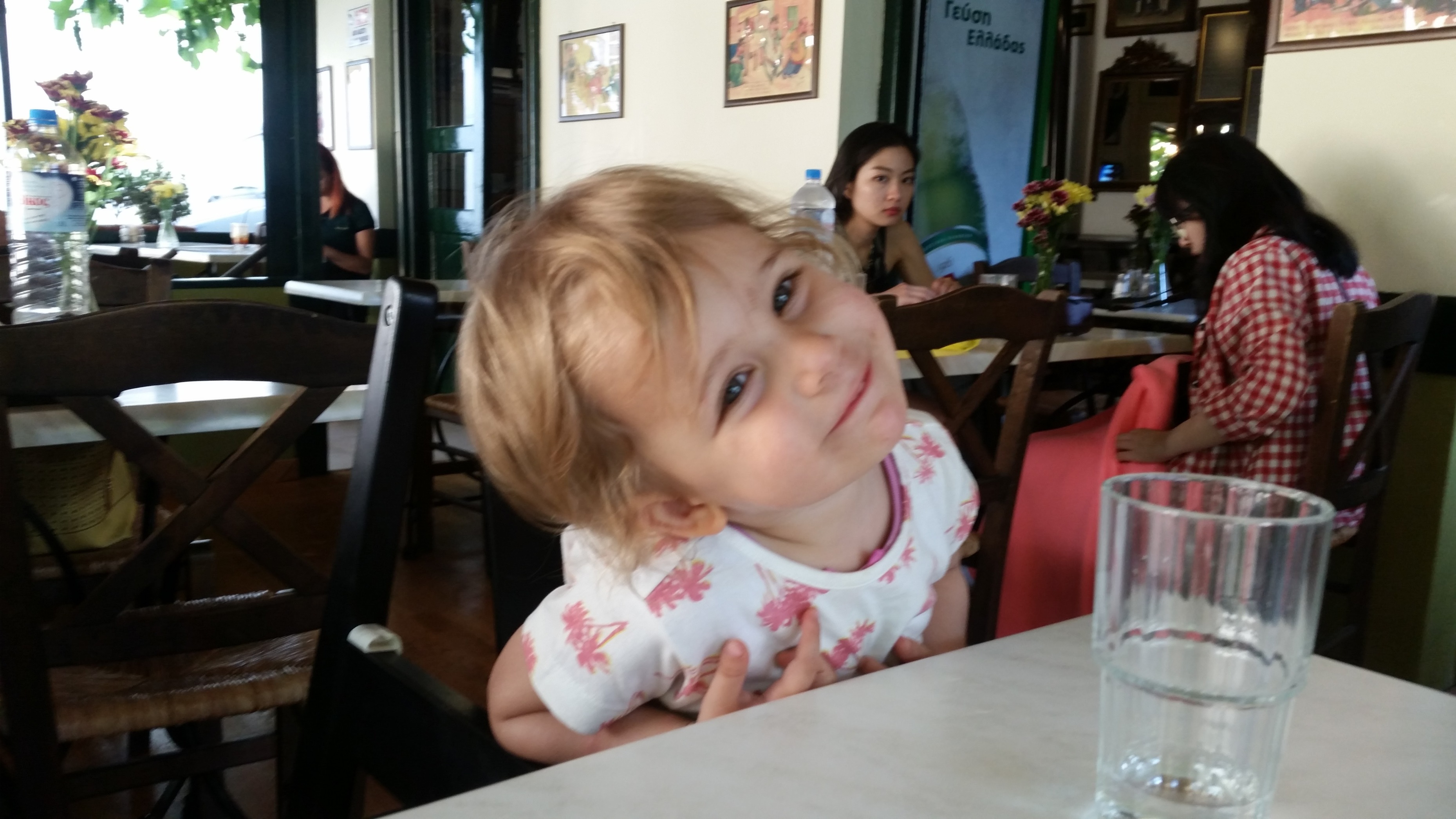 Restoranda sakin oturmak nedir bilmeyen Maya ve arkadan bize ters ters bakan turist kız. O bakışların ne sinir bozucu olduğunu küçük çocukla restoranlara giden, uçağa binen anneler iyi bilir. Eskiden ben de aynı o turist kız gibiydim gerçi, çocuk görünce restoranda, uçakta yerimi değiştirirdim. Etme bulma dünyası 😉