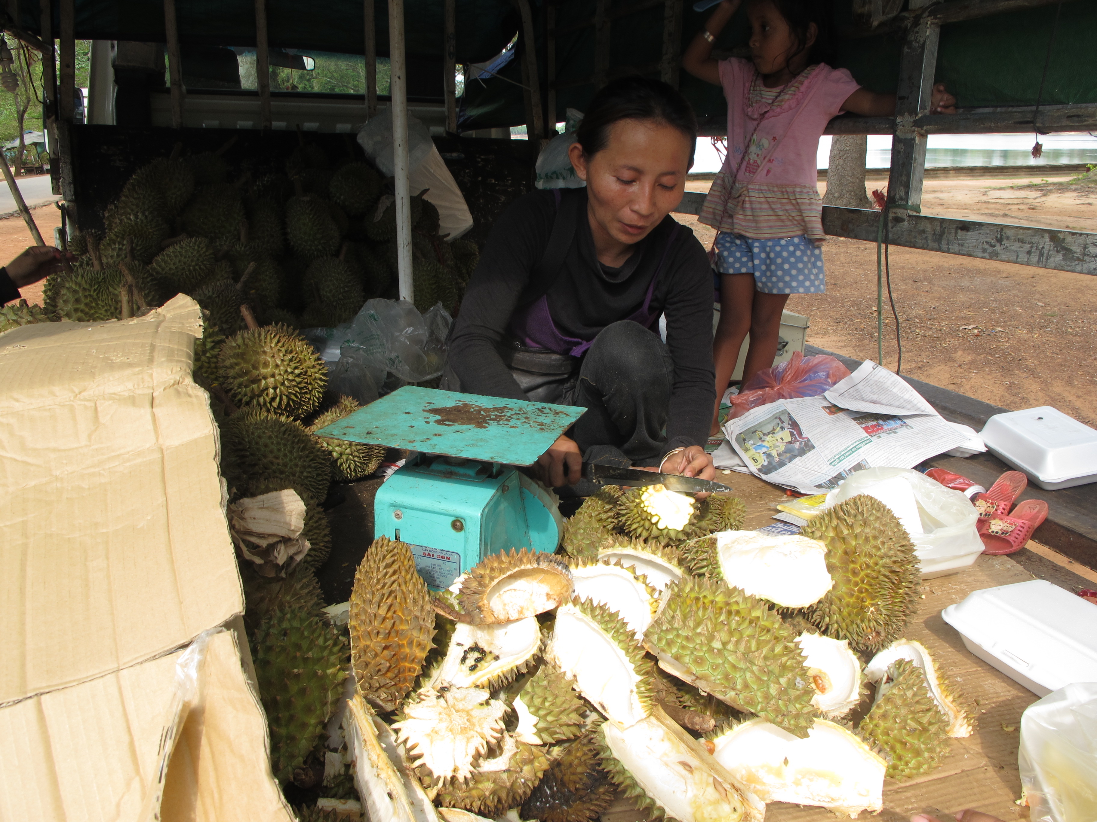 • Veeee en unutulmaması gereken: Kamboçya bir Durian cenneti! Daha önceki yazılarımda da bahsettiğim bu meyve ile aşkım tam da bu şehirde, yani Siem Reap’te başladı. Anlatmaya çalışsam, anlatamam bu meyvenin tadını. Bu yüzden dedikodulara, beğenmeyenlerin eleştirilerine aldırmayıp mutlaka denemeli ve kendi kararınızı vermelisiniz. Ya sevecek ya nefret edeceksiniz. Kamboçya’da bu meyve “Meyvelerin kralı” olarak biliniyor. Kamboçya standartlarında oldukça pahalı olmasına rağmen (yerli halk için ve  turistler için aynı fiyat geçerli: kilosu 2-3 Dolar civarı), yerli aileler sofralarını bu meyveden mahrum etmiyorlar. Sokaklarda Durian satıcıları görmek mümkün. Tayland’dakilerin aksine burada parçalanmış, yarım, çeyrek durianlar satılmıyor. Tüm bir durian almak durumundasınız ki bu da en az 1 kiloluk bir meyve. Temizleyip, kesip size yenmeye hazır biçimde veriyor satıcılar. Her gün bir kiloyu tek başıma yedim. Otellere, otobüslere yanımda taşıdım, bazen yasaklara aldırmadan. Herşeyi göze aldım günlük durian dozum için. Şimdi nasıl zor geliyor ayrı kalmak… Durian ticaretine mi başlasam, niye yoklar Avrupa’da?