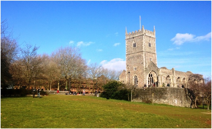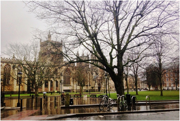 Collage Green ve arkada Bristol Katedrali / College Green dedikleri yer Park Street girişinde, hemen Bristol Üniversitesi’nin başında, güneşli havalarda burası çok şenlikli oluyor. Buranın hemen yanında Belediye Binası da var.