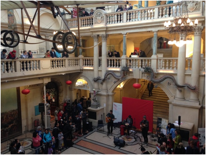 Bristol Müzesi – Çin yeni yılı Kutlamaları Sırasında / Müzisyenlerin solunda duran kafasına kova geçirilmiş heykel Banksy.