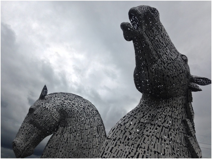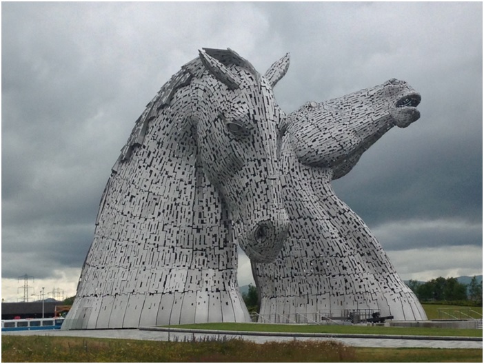 Kelpies heykelleri Edinburgh ile Glasgow arasında, Falkirk denen bölgede kalıyor. Yaklasık 30 metre boyunda, tamamıyla metalden yapılmış at başı heykelleri. Aslında çok yeni, 2013 yılında inşa edilmiş, 2014 yılında da ziyarete açılmış. İskoçya’nın sayesinde yükselen ve endüstriye geçişte kullanılan tarihi mirasının atlar olması sebebiyle at heykelleri seçilmiş. Kelpie İskoç mitolojisinde geçen bir tür su kenarında yaşayan periymiş, ama 10 at gücündeymiş.