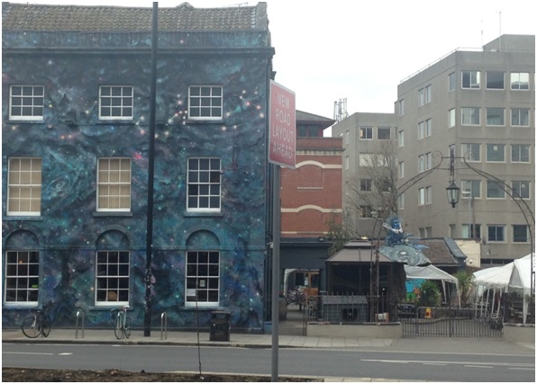 Buraya giderken merkezin biraz ilerisinde, otobüs terminalinin yakınında Bear Pit diye bir yer var, aslında alt geçit gibi bir şey, ortası da kocaman bir boşluk, ama garip bir şekilde oraya kocaman bir ayı heykeli yerleştirmisler, neyse. Orayı geçip once Stokes Croft sokağına sapıyorsunuz, Full Moon Backpackers Hostelini ve Attic Bar’i geçiyorsunuz, ki çok güzel bir bina.