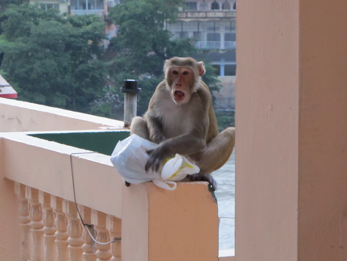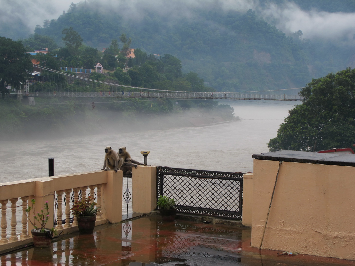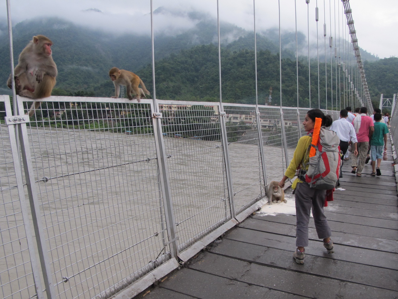 Rishikesh iki ana bölgeye ayrılmış durumda; kalabalık ve pek de çekici olmayan merkez ve daha kuzeyde Ganj kenarında bulunan Himalaya manzaralarıyla çevrili güzeller güzeli, bizim de konakladığımız bölge. Ganj nehrinin ikiye böldüğü kuzeydeki bu bölgenin iki yakasını Ram Jhula ve Lakshman Jhula köprüleri birleştiriyor. Her iki köprü de maymunların işgali altında… Korkuluklara tırmanan, insanların arasında koşturan bir dolu maymun ve aralarında yürüyen renkli sarili kadınlar, hint münzevileri (sadular) ve tabii ki kutsal inekler ile bu iki köprü sürekli canlı, renkli, şenlikli bir manzara oluşturuyor. Rishikesh turistler için bir cennet. Hem yoga, meditasyon, müzik ve dans kursları, bir çok konaklama imkanı, her zevke göre (hatta pizza, hamburger gibi batılı yemekleri bile bulabileceğiniz) restoran ve kafeleri ile konforlu, hem de saduları, aşramları, kutsal nehri ziyarete ve ibadete gelmiş yerli halkı ile otantik ve doğulu…