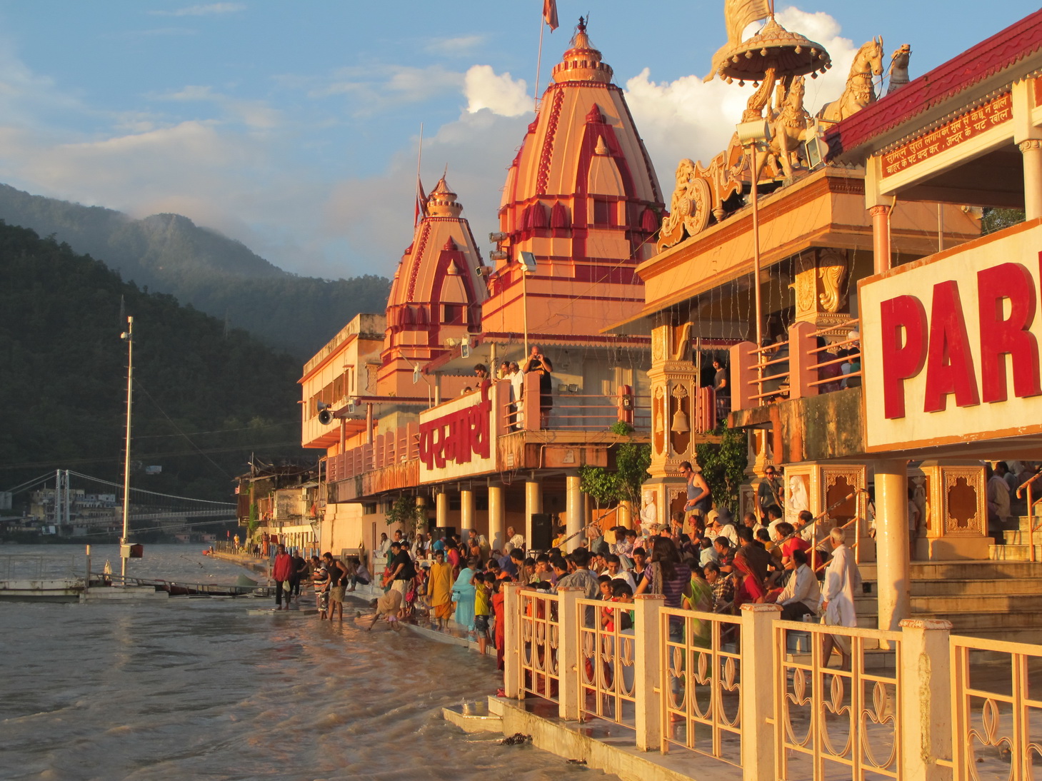 Rishikesh’te Ganj nehrinin diğer kutsal şehirlerinde de (daha sonra Haridwar ve Varanasi’de de göreceğiz) olduğu gibi her akşam üzeri gün batımında Ganga aarti denilen dini tören uygulanıyor. Pek çok Hintli ve tabii ki seremoniyi görmek isteyen turistler Ganj kenarındaki Swarg bölgesinde Parmarth Niketan aşramı önünde toplanıyorlar. Mantralar ve müzik eşliğinde küçük çiçek buketleri içlerine konulmuş mumlarla birlikte Ganj nehrine bırakılıyor, bazen mantralar sonrası  turistler icin özel olarak programa sonradan eklendiğini tahmin ettiğim dini danslar yapılıyor. Çiçek buketleri satan çocuklardan bir buket alıp, içindeki mumu yakıp Ganj’a bırakırken, çıplak ayaklarımla sarili Hintli kadınlarla yanyana pasta-tapınak’ın 13 katını arşınlarken ama özellikle alnımın ortasındaki bindi ve şalvarımla pazaryerinde gezerken satıcılar benimle Hintçe konuşmaya başladığında kendimi iyiden iyiye bu şehre ait hissediyorum.