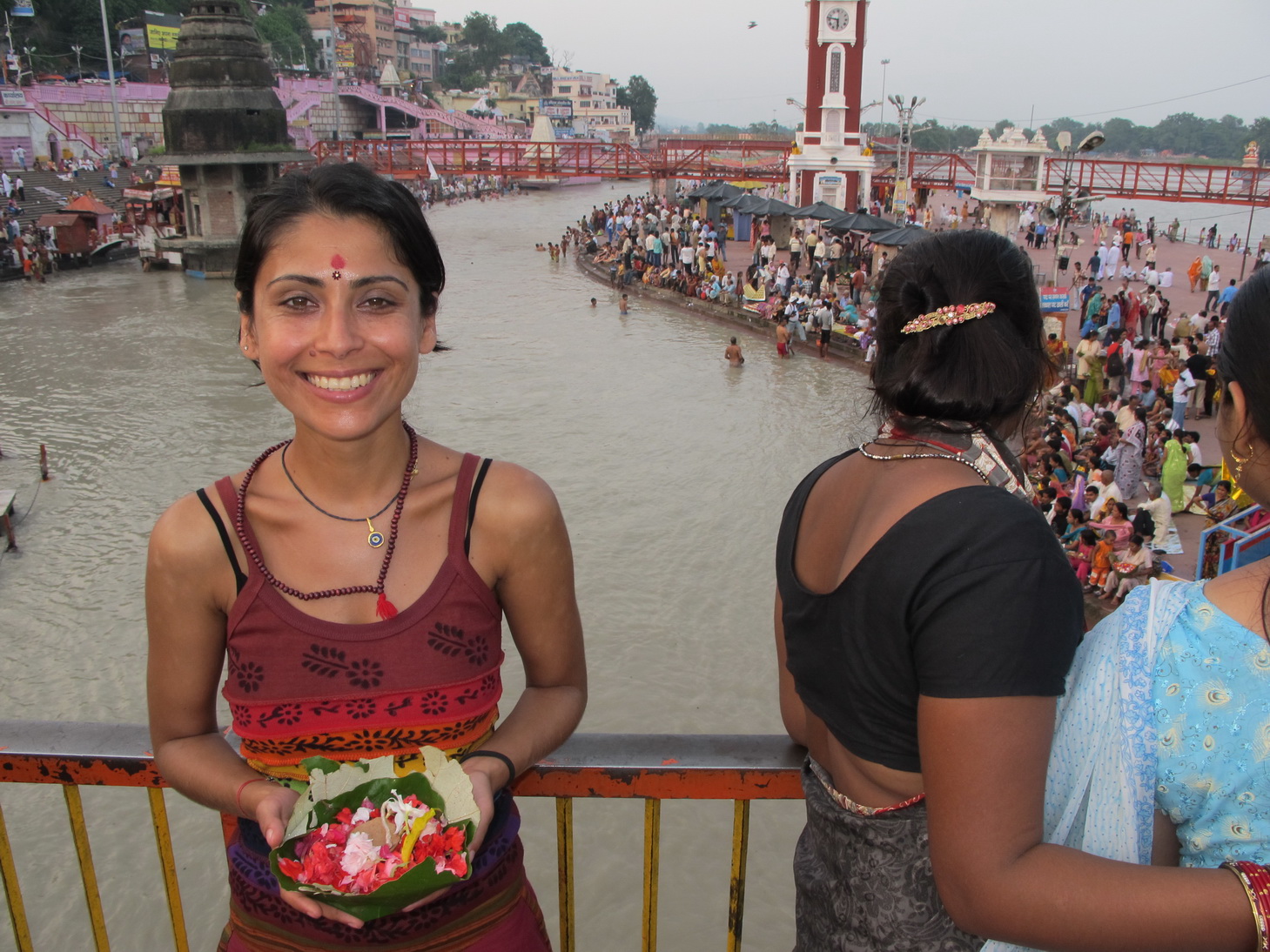 Haridwar’da Ganga aarti törenine hazırlık. Ben de çiçeğimi aldım, törene katıldım!