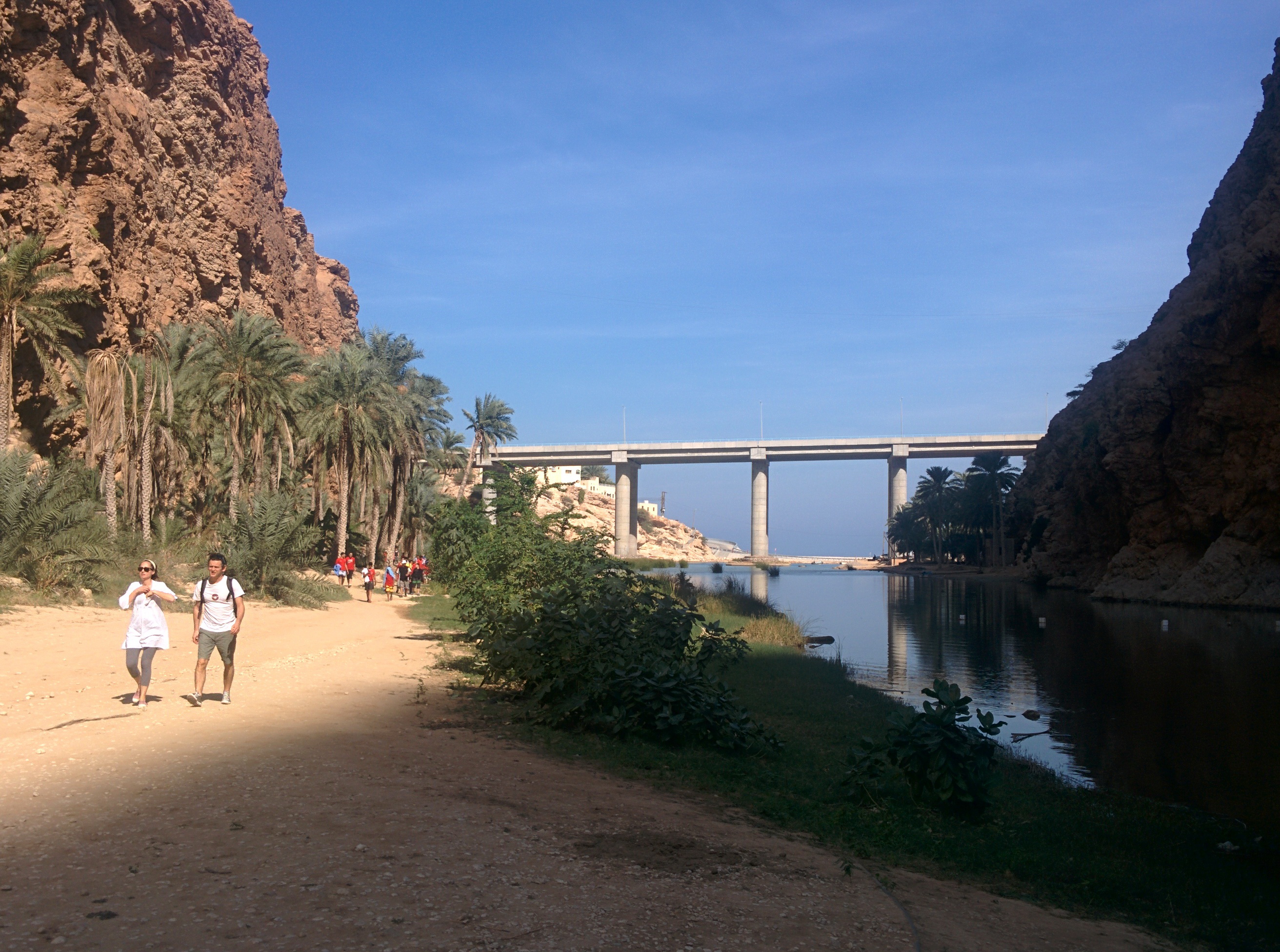 Wadi Shab’a vardığımızı anlamamız için bayağı bir uğraşmamız gerekti zira bomboş bol şeritli bir otobandan Tiwi istikametine doğru 170 km kadar gidip bir anda otoban köprüsü altında enteresan bir park yerimsi yerde durduk, Gps’imizin buyruğu üzerine!