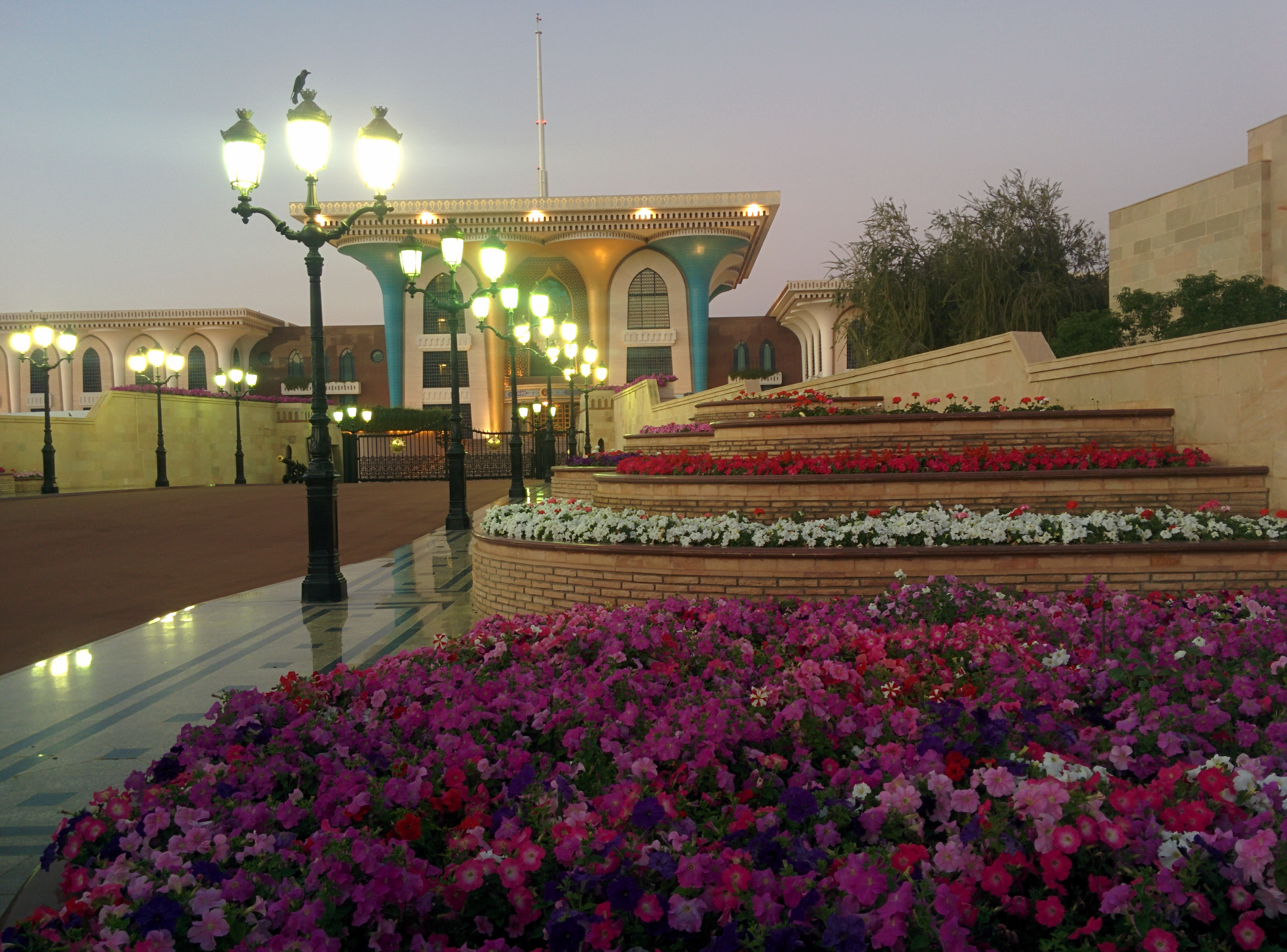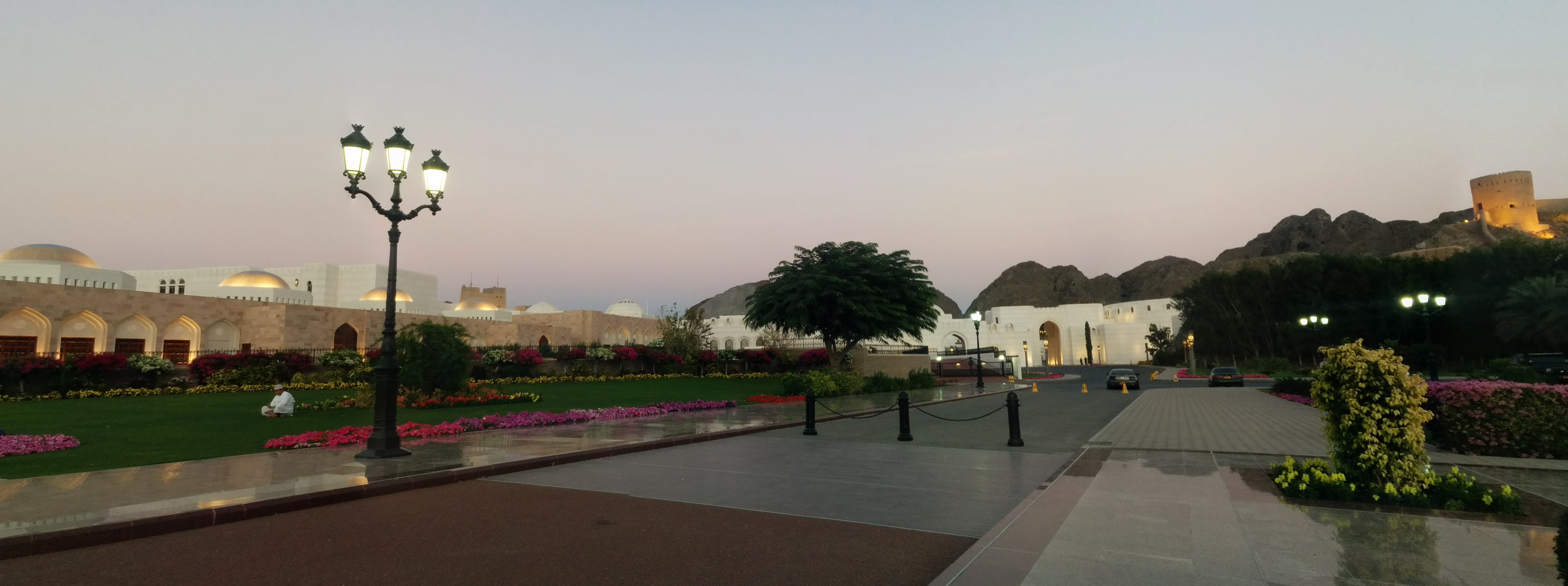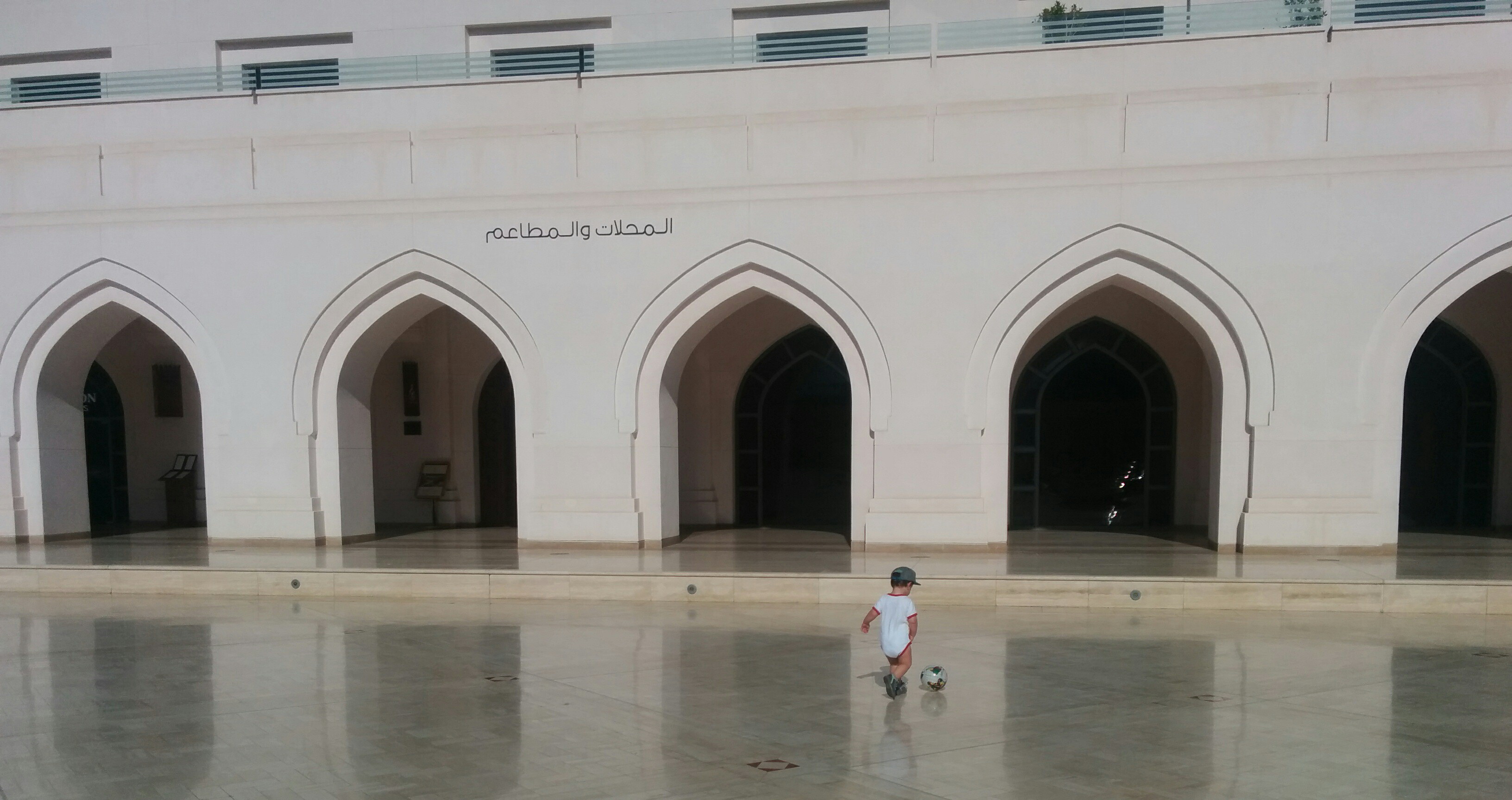 Saray 16. yüzyılda Portekizliler tarafından inşa edilmiş muazzam iki eski kalenin orta yerine konuşlanmış, Quaboos’un artık aşina olduğumuz rafine ama gayet oriyentalist mimari zevkini yansıtan bir binadan ve de muhteşem bir bahçeden oluşuyor. Çok güzel deniz manzarası da varmış sultanın yalancısıyız 🙂 İçi ziyaret edilemese de muazzam lüks olduğu söyleniyor. Bahçesini görmek özellikle de güneş batarken çok keyifli. İki saattir arabada oturmaktan imanı gevremiş Elvin trafiğe kapalı mermer yollarda koşup oynayıp deşarj olurken ben de bolca fotoğraf çekebildim, mutluyum gururluyum 🙂 Saray’ın yanında bir de hoş bir camii var, tam akşam namazı saati olduğundan içini ziyaret edemedik maalesef.
