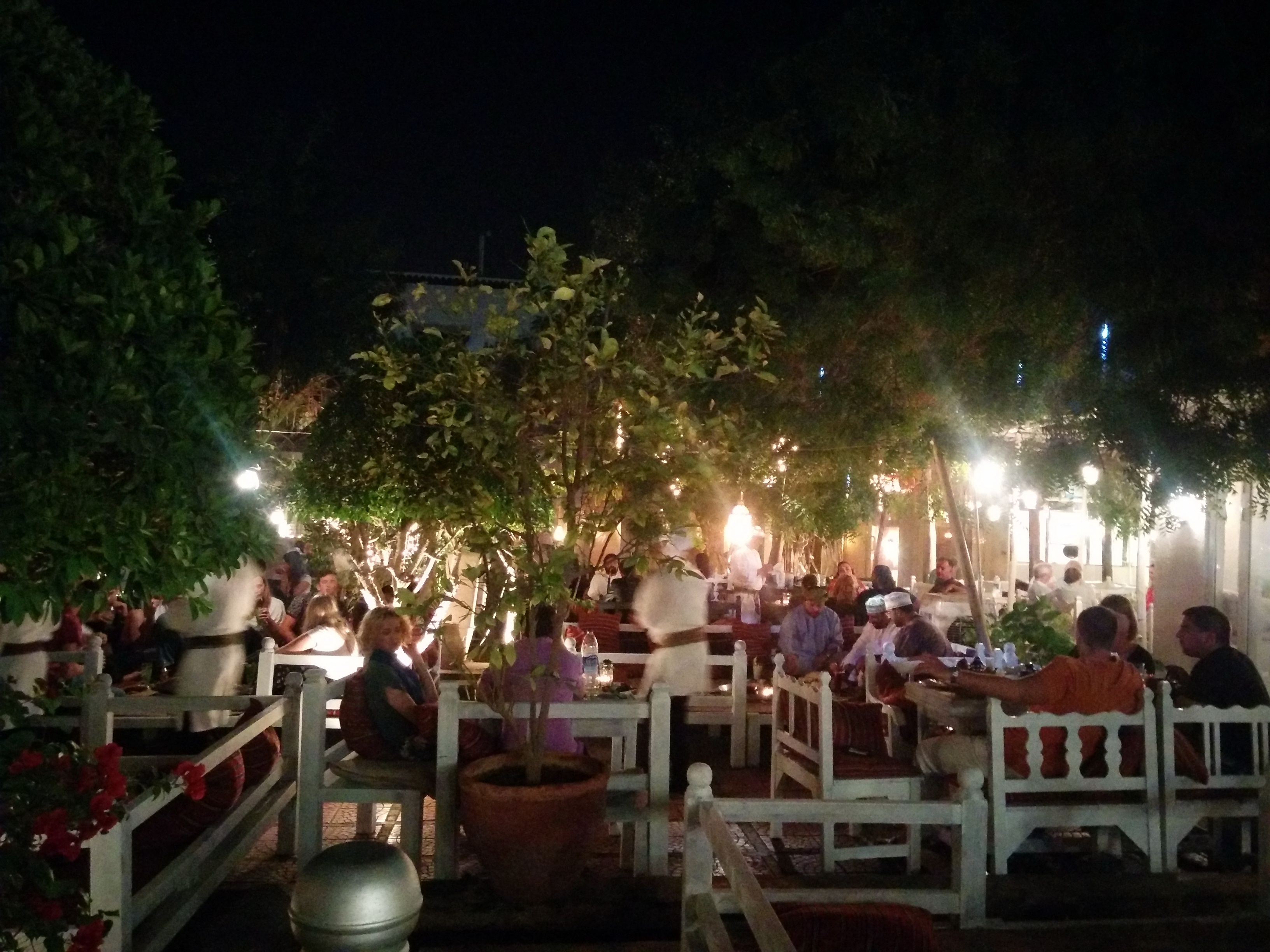 Al Angham Restoran geleneksel Umman mutfağını şık bir şekilde sunan gayet gusto bir mekan. Alkol Umman’daki pek çok restoranda olduğu gibi burada da yok ama billur kadehlerde sunulan birbirinden güzel taze meyve suları ortamı kurtarıyor. Ben nar suyu içtim, kırmızı şarabı aratmadı o ortamda! Ayrıca gül suyu ve safranlı pilav, deve sütünden dondurma gibi Umman’ın unutulmaya yüz tutmuş geleneksel lezzetlerini canlı tutmaya çalışan bir yer. Servis muhteşem, resmen sultan gibi hissettiriyorlar. Fiyatlar yüksek ama eğer kutlanacak bir şeyiniz varsa ya da benim gibi bir gecelik kendimi şımartayım derseniz kesinlikle tavsiye ediyorum bu Opera House’daki konser üzerine Al Angham yemeği programını.